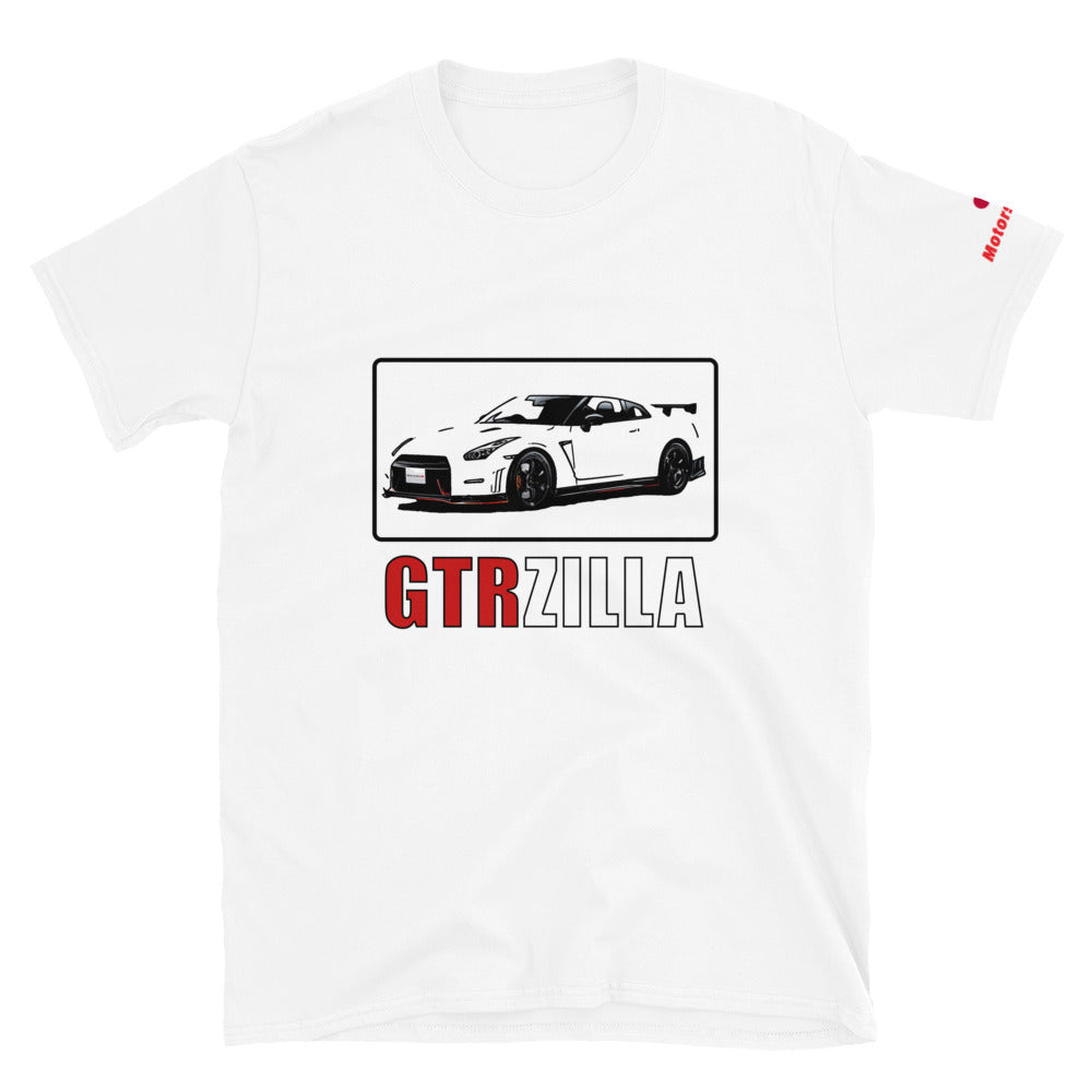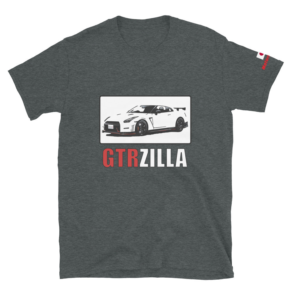 You've now found the staple t-shirt of your wardrobe. It's made of a thicker, heavier cotton, but it's still soft and comfy. And the double stitching on the neckline and sleeves add more durability to what is sure to be a favorite! The monster from the land of the rising sun, GTRZilla. GTRZilla and GTR front print with Japan flag and "Motorsports" print on left sleeve. GTRZilla Shirt.