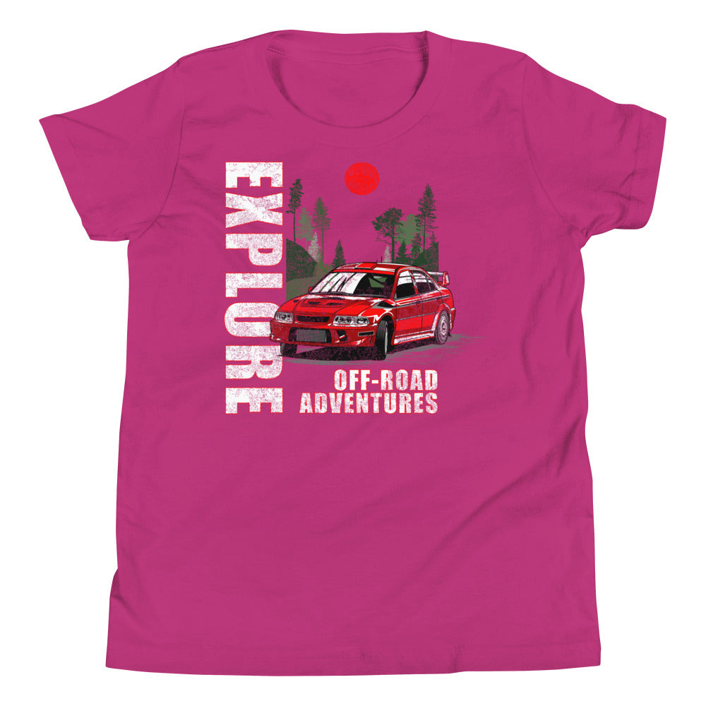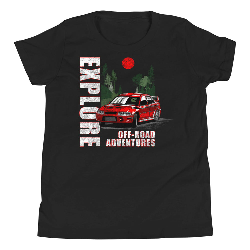 This is the tee that you've been looking for, and it's bound to become a favorite in any youngster's wardrobe. It's light, soft, and comes with a unique design that stands out from the crowd wherever you go! Inspired by the rally champ EVO. Explore off the beaten path and find new adventures. Explore Off-Road Adventures Evo Youth Shirt.