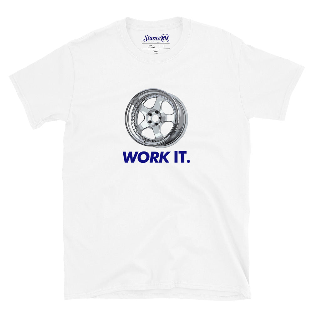 You've now found the staple t-shirt of your wardrobe. It's made of a thicker, heavier cotton, but it's still soft and comfy. And the double stitching on the neckline and sleeves add more durability to what is sure to be a favorite! The work it graphic t-shirt, because you put in work. Work It Shirt.